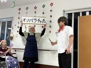 今年の2階のクリスマス会は、ケア横ブラザーズ(事務長と介護士)によるマジックショーがメインイベント。