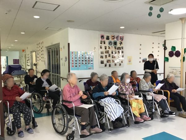 参加された皆さまは歌詞カードを手に取り、はじめは控えめな声でしたが、曲が進むにつれて声に張りが出てきて、表情も次第にほころんでいきます。