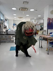 利用者さんたちは、目の前で舞う獅子にくぎ付けで、「すごいねぇ」と声を漏らしたり、スマホを取り出して動画を撮ったりと、とても楽しそうな様子。